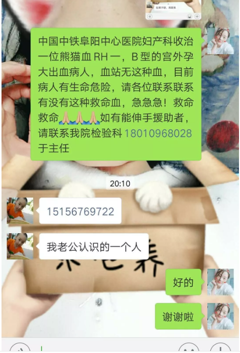 时间紧急,病情危重,患者已经出现休克状态,该院医护人员立刻同患者家属沟通献血事宜,却得知患者家族中无相同血型。医护人员随即与阜阳市中心血站联系,却得知阜阳市中心血站熊猫血告急!怎么办?!时间一分一秒流逝,患者出血量持续增加,随时有生命危险!该院医务人员即刻在院内外微信群、QQ群、朋友圈发出求救,同时与阜阳市广播电台取得联系,积极向广大市民求救,仅仅几分钟,整个朋友圈热心人士百余人转发此条消息,具有相同血型或联系方式的热心市民,在半个小时内就打爆了该院检验科主任的手机。经过多方联系,积极调配,19:00左右,阜阳市中心血站将别院提前预约的800毫升红细胞,400毫升血浆及时调配给该患者使用,所有人悬着的一颗心才落了下来。