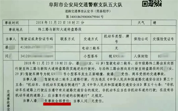 阜阳一女子女子被撞受伤!交警判其全责并赔偿!