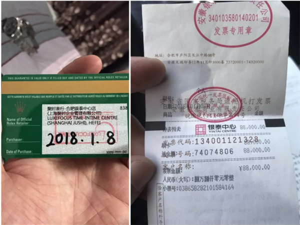 这块手表是余先生的妻子送给他的12周年结婚纪念日礼物,今年1月份刚买的,购物小票余先生都还保留着。