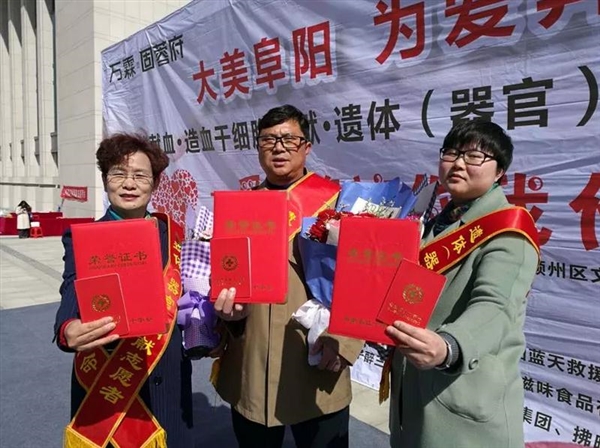 4月7日,在我市举办“大美阜阳,为爱奔跑”无偿献血、造血干细胞捐献、遗体(器官)捐献主题宣传活动上,对市环卫局职工李建举一家三口自愿捐献遗体(器官),用作医学研究和需要的患者的行为进行表彰。据悉,一家三口全部志愿捐献遗体(器官),在我市尚属首例。