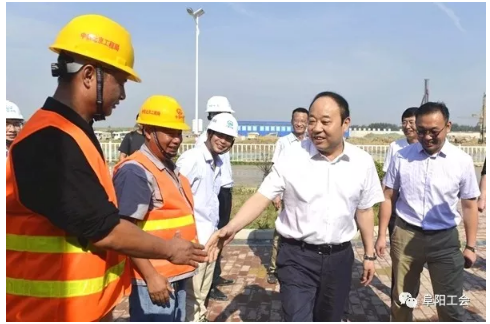 7月19日,省人大常委会副主任、阜阳市委书记李平在市政协副主席、市总工会主席李进和市总工会党组书记、副主席房继红等领导的陪同下,冒着酷暑来到部分重点项目建设现场,代表市委市政府看望慰问一线劳动者,并向