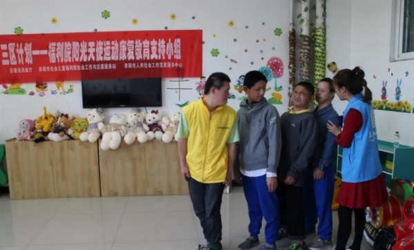 2018年4月19日,“三区计划”项目社工为阜阳市社会儿童福利院的孩子们开展了第五节阳光天使运动康复教育支持小组活动,这也是本次运动康复教育支持小组的最后一次活动。孤残儿童运动康复教育支持小组为组员创